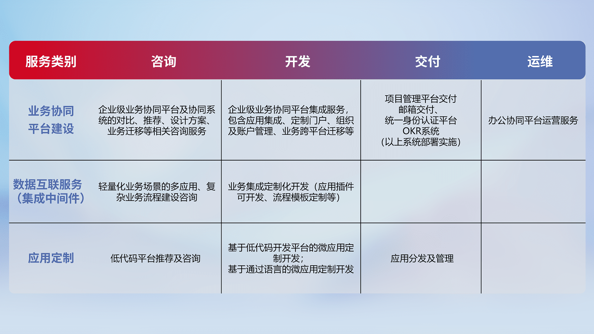 针对钉钉、、、、企微、、IDaas等平台级产品提供产品的规划、、、方案、、交付、、定制化开发等服务,,,实现如统一协同办公、、、智能客户服务、、、混合会议管理、、、、智能数据查询、、、等业务场景,,,,实现数字化转型。。。